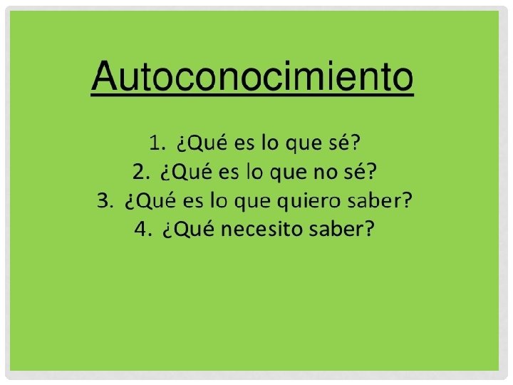 AUTOCONOCIMIENTO • Antes de comenzar la lectura el estudiante debe preguntarse por lo que sabe, requiere , recuerda o cree del texto. • Declarar, verbalizar, los pequeños enunciados que logra rescatar.