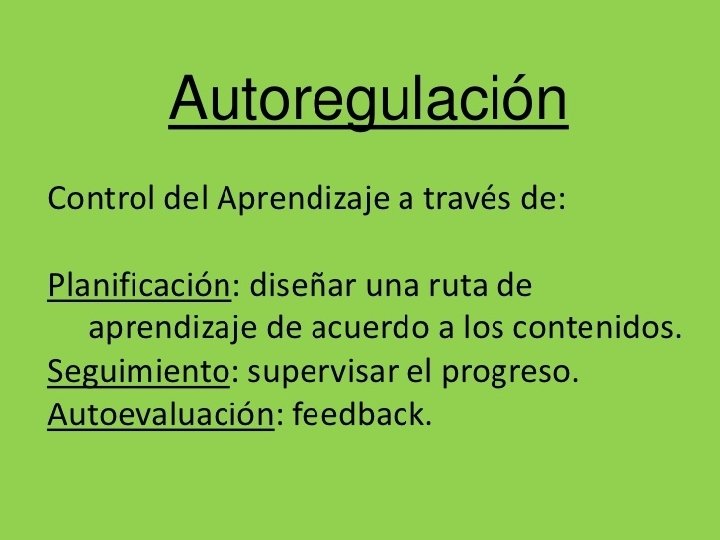 AUTORREGULACIÓN DEL APRENDIZAJE PLANIFICACIÓN • Planificar lo que va a estudiar de acuerdo al orden que estableció el profesor, o al orden de importancia de los contenidos. Definir lo que quiere aprender, pues no puede aprenderlo todo. Debe administrar correctamente sus energías y atención.