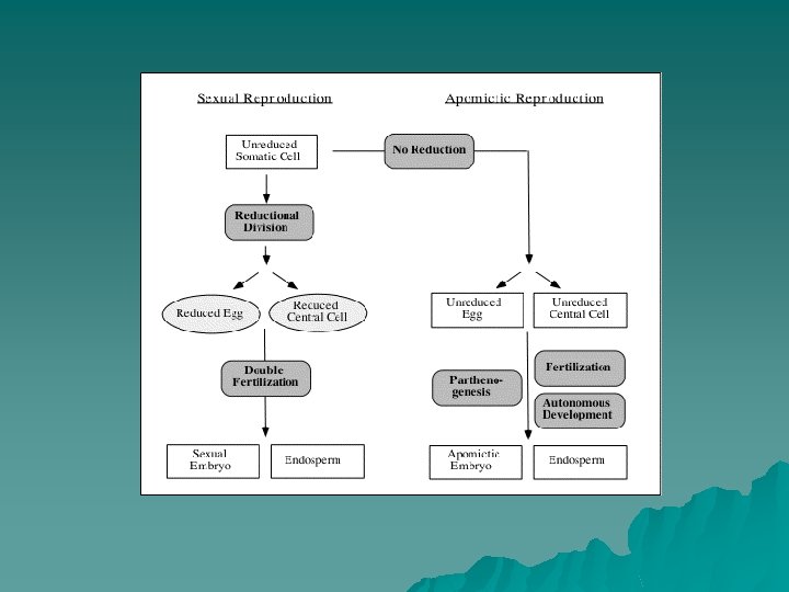Apomixis Las semillas se reproducen a través de otros proceso distintos de la meiosis normal y la fecundación. ØPartenogénesis. El embrión se desarrolla directamente de un huevo no fertilizado, que puede de haploide normal o diploide anormal. ØApogamia. El embrión se desarrolla de núcleos haploides diferentes a los huevos (fusión de células del saco embrionario, como antípodas, sinérgidas, núcleos polares), es muy frecuente en cítricos y en mango. ØAposporia. El saco embrionario se forma directamente de una célula somática diploide, sin la reducción y formación de esporas. ØDipolosporia. El embrión proviene directamente de la célula madre o megaspora.