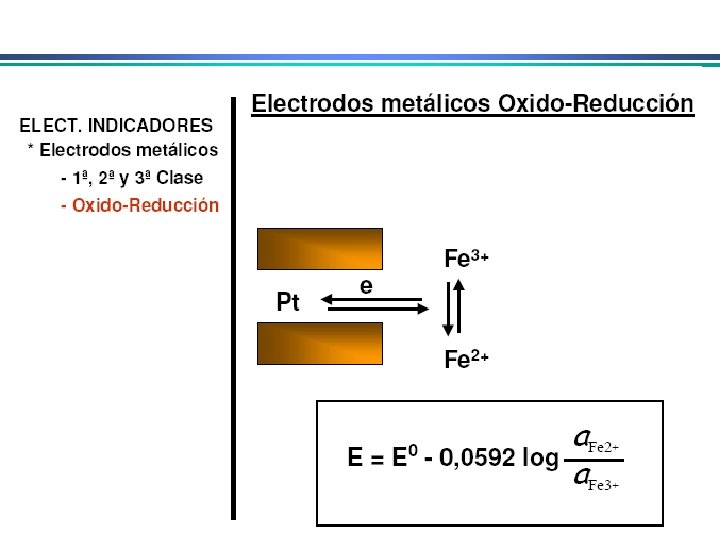 Eletrodos Indicadores Metálicos 3. Eletrodos indicadores metálicos do 3 o. tipo Um eletrodo metálico pode, em algumas circunstâncias, responder a cátions diferentes Ex. Eletrodo de mercúrio para determinar a [Ca 2+] em solução 4. Eletrodos indicadores metálicos redox Eletrodos de Pt, Au, Pd e metais inertes servem como indicadores em sistemas de oxidação/redução. Eletrodos atuam como fonte para elétrons transferidos de um sistema redox em solução. Ex. Eletrodo de platina em solução contendo Ce 3+ e Ce 4+ E = Eo – RT ln a. Ce 3+ n. F a. Ce 4+