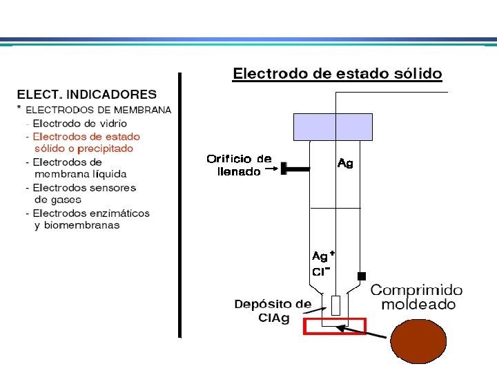 Eletrodos Indicadores Metálicos 2. Eletrodos indicadores metálicos do 2 o. tipo Um eletrodo metálico que responde à atividade de um ânion ao qual seu cátion forma um precipitado ou um complexo estável Ex: prata como eletrodo do 2 o. Tipo para haletos: Ag+ + e. Ag(s) Eo. R= 0, 799 V Ag. I(s) + e. Ag(s) + IE = Eo – RT ln 1 n. F a. I-