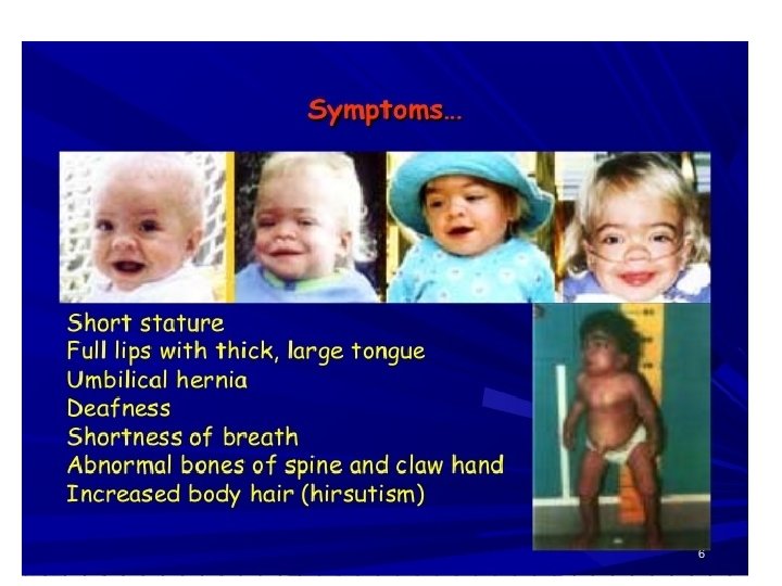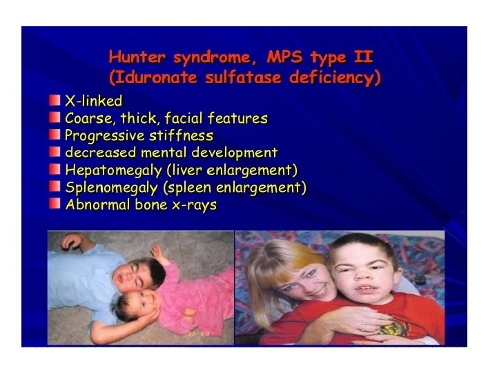 Clinical features • • • Developmental delay Coarse thick facial features Low nasal bridge Prominent dark eye brows Progressive joint stiffness Severe mental retardation