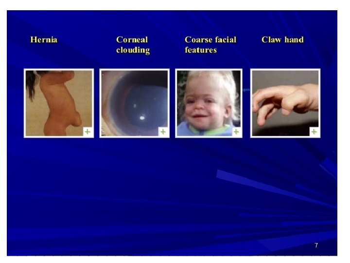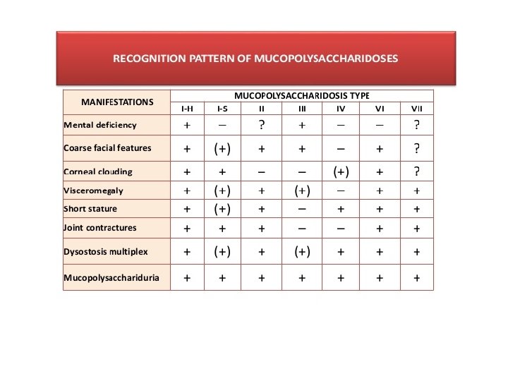 Common presentations • CNS disease – mental retardation , developmental delay , severe behavioral problems , hydrocephalus • CVS disease- Valvular dysfunction • Pulmonary disease- airway obstruction, sleep apnoea • Opthalmologic – corneal clouding • Hearing impairment – deafness • Musculoskeletal disease- short stature, joint stiffness • Others – coarse facial features , hepatosplenomegally , hernia