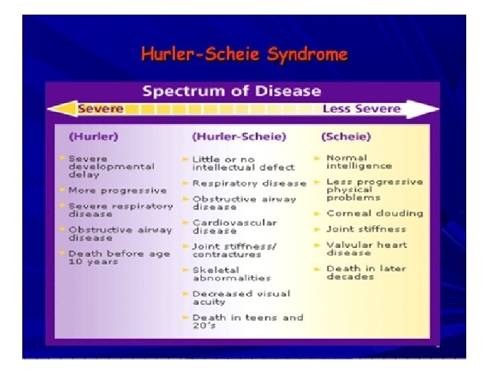 Diagnosis • High index of suspicion- a child with coarse facial features, bone disease, developmental delay, short stature, hepatosplenomegally , corneal clouding • GAG urinary concentration • Lysosomal Enzyme assay – definitive diagnosis from cultured fibroblasts, leukocytes • Prenatal diagnosis in selected family clustersamniocytes and chorionic villus culture