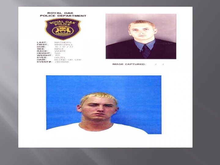 MARSHALL MATHERS, EMINEM, SLIM SHADY Marshall Mathers, III (aka Eminem) was arrested twice in June 2000 on gun charges in Michigan, and was hit with probationary sentences in both cases, one in Royal Oak, the other in Warren (above you'll find mug shots from both those arrests). The rapper was nabbed by Warren cops for carrying a concealed weapon and assault after fighting with a man he saw kissing his estranged wife Kim outside of a club. He also got popped for brandishing a weapon during a parking lot beef with members of the rival rap outfit Insane Clown Posse