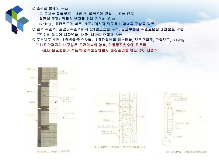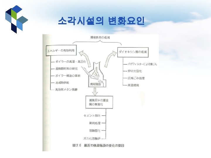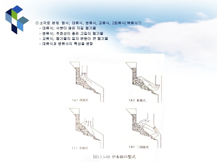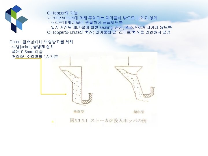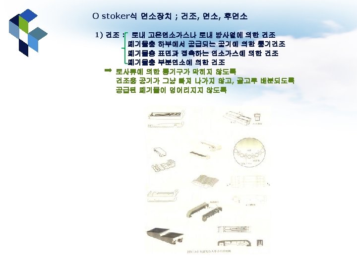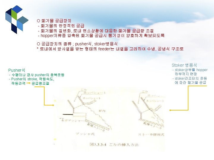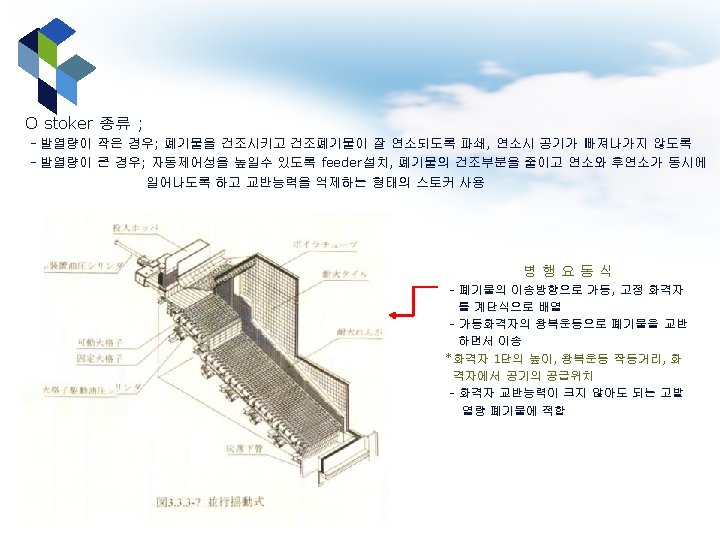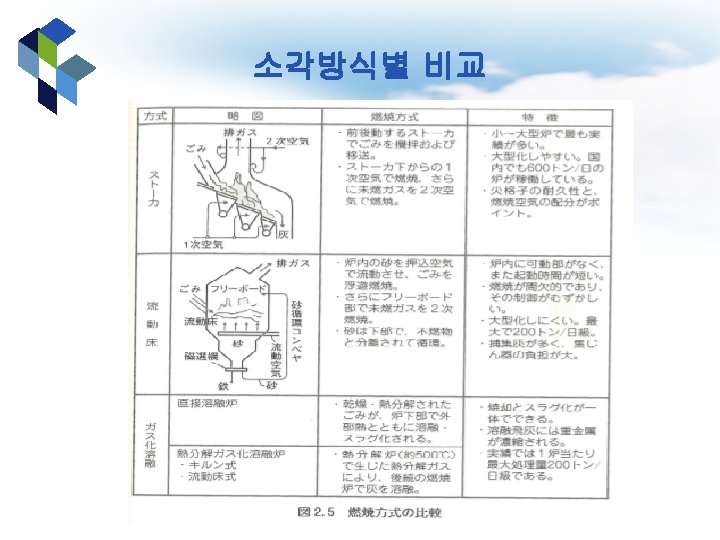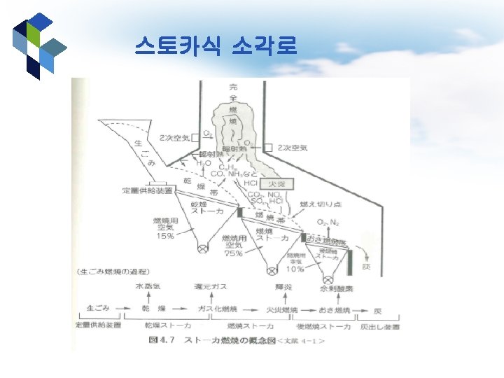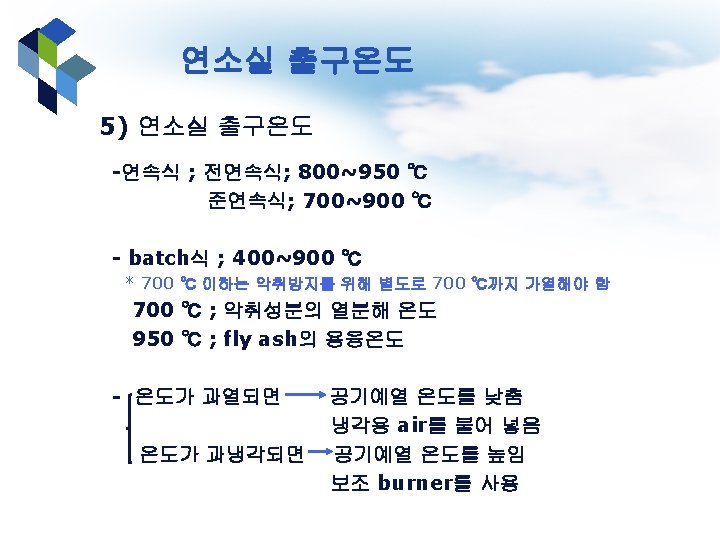 고형연료 사용시설에서의 대기오염물질 배출조사 결과 O 고형연료 사용시설에서의 대기오염물질 배출특성 실측결과 (국립환경과학원 - 2011년 실측자료) 가스상 물질 분석결과 A(SRF-RPF) 항목 B(SRF-RPF) C(SRF-RPF) D(Bio-SRF-WCF) E(혼소 : RPF, RDF, WCF) 배출허용기준 전단 CO(ppm) 200(12) NOx(ppm) 100(12) SOx(ppm) 50(12) HCl(ppm) 20(12) 후단 전단 후단 42. 1 49. 5 106. 6 87. 3 651. 3 270. 9 79. 3 38. 5 38. 3 34. 7 (9. 9∼ 55. 2) (22. 7∼ 108. 6) (45. 0∼ 200. 6) (3. 5∼ 146. 3) (225. 7∼ 1416. 7) (12. 8∼ 1188. 2) (32. 2∼ 107. 3) (12. 9∼ 52. 2) (14. 4∼ 96. 5) (11. 1∼ 227. 8) 67. 8 78. 4 109. 6 73. 3 55. 2 52. 1 75. 2 58. 7 84. 1 39. 8 (64. 3∼ 72. 5) (37. 4∼ 90. 9) (89. 5∼ 123. 0) (13. 8∼ 88. 3) (28. 3∼ 78. 3) (13. 9∼ 71. 5) (6. 9∼ 140. 7) (12. 8∼ 125. 4) (58. 4∼ 104. 1) (24. 5∼ 45. 8) 0. 6 0. 2 0. 1 0. 4 1. 0 0. 6 25. 6 2. 7 0. 1 (0. 4∼ 0. 9) (0. 0∼ 1. 0) (0. 0∼ 0. 1) (0. 0∼ 1. 3) (0. 0∼ 2. 2) (0. 0∼ 6. 4) (7. 7∼ 52. 5) (0. 2∼ 6. 2) (0. 0∼ 0. 6) (0. 0∼ 0. 7) 6. 4 1. 3 36. 7 3. 1 74. 5 4. 9 7. 9 1. 1 10. 6 3. 7 THC 분석 결과 A 항목 배출허용기준 THC 10 ppm B C D E 전단 후단 전단 후단 92. 1 97. 1 26. 3 116. 8 13. 9 2503. 1 43. 2 277. 0 20. 4 먼지 및 중금속 분석 결과 A 항목 B C D E 배출허용기준 전단 후단 전단 후단 40(12) 454. 8 1. 5 973. 7 1. 6 995. 3 6. 9 367. 8 1. 2 1784. 6 3. 3 Cr(mg/m 3) 1 0. 12 N. D 2. 95 N. D 2. 64 0. 01 0. 27 N. D 0. 24 N. D Cd(mg/m 3) 0. 1(12) 0. 27 0. 01 2. 57 0. 31 0. 74 0. 40 0. 63 0. 22 0. 50 0. 05 Ni(mg/m 3) 0. 01 24. 37 0. 01 7. 53 0. 03 0. 34 0. 12 2. 43 N. D 0. 02 먼지(mg/m 3) 20 0. 63 Cu(mg/m 3) 10 0. 11 N. D 1. 86 0. 25 0. 41 0. 11 0. 31 0. 10 0. 36 Pb(mg/m 3) 1. 6(12) 1. 43 0. 01 37. 66 0. 22 36. 52 0. 19 1. 86 N. D 0. 84 N. D Zn(mg/m 3) 10 6. 78 0. 01 95. 68 0. 04 158. 48 0. 77 7. 30 2. 43 10. 83 0. 16 Hg(mg/m 3) 0. 1(10) 7. 37 1. 79 20. 31 4. 03 9. 62 2. 08 0. 70 0. 17 46. 40 5. 93 비소(ppb) 500(12) 12. 64 1. 95 4. 91 1. 23 5. 56 2. 40 11. 71 0. 83 2. 26 3. 79 참고 : 폐기물 고형연료 사용시설의 대기오염물질 배출저감 방안 연구(국립환경과학원_2011) • THC, Hg : 모든 사용시설에서 배출허용기준 초과 고형연료 품질 기준 강화 필요 • 방지시설 전·후 농도 차이가 크게 남 적절한 방지시설 의 설치 및 운영 필요