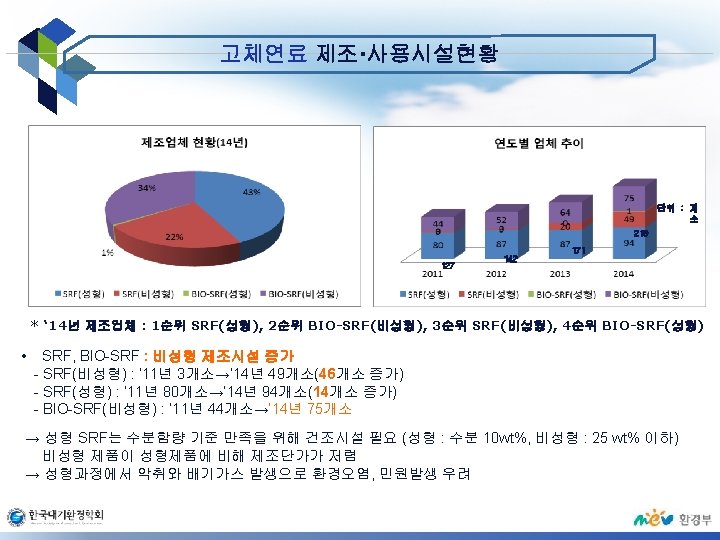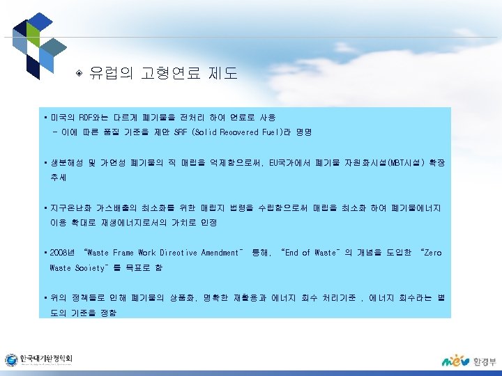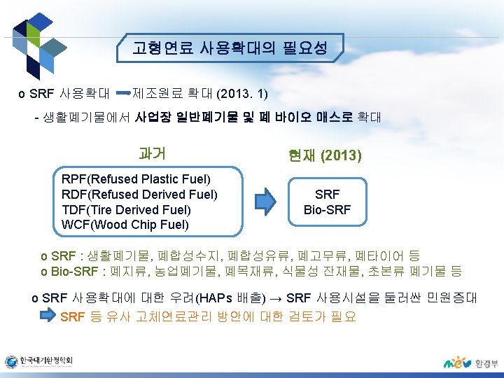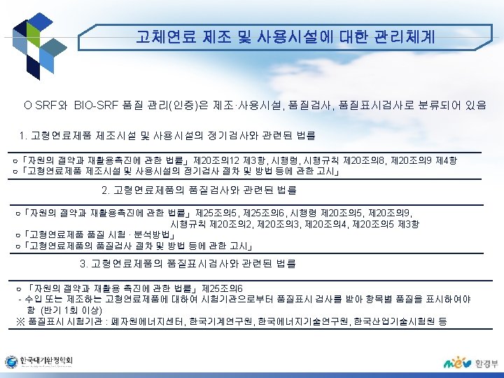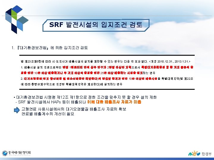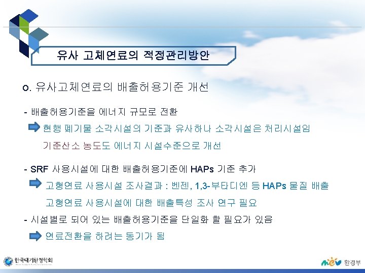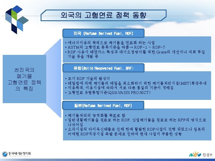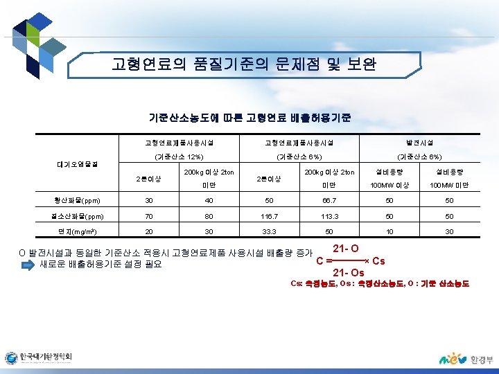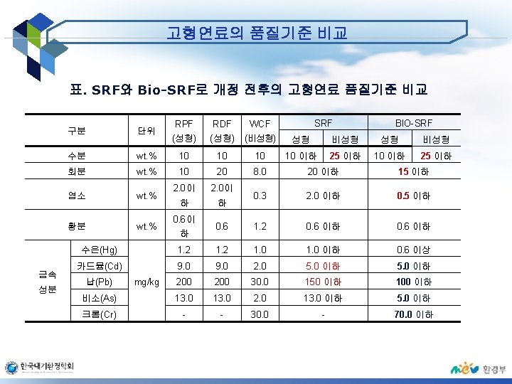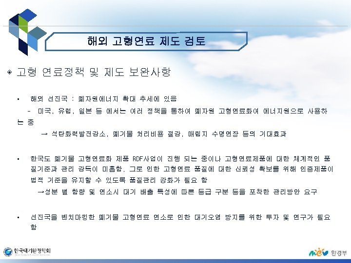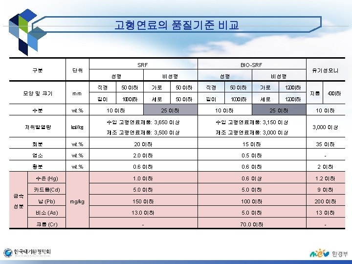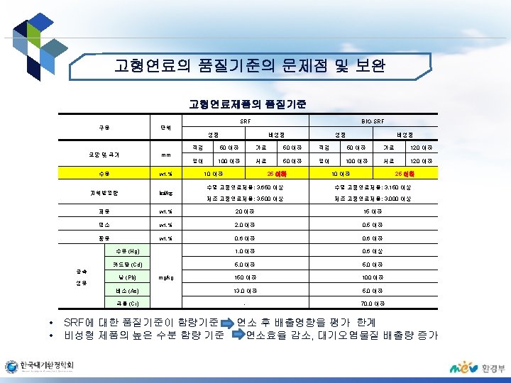 고형연료의 품질기준의 문제점 및 보완 고형연료 혼합시설에서의 대기배출허용 기준(WID ANNEX Ⅱ) solid fuels with excepiton of biomass(O 2 ontent 6%) biomass(O 2 content 6%) liquid fuels(O 2 content 3%) 구분 ∼ 50 MWTh 50∼ 100 MWTh 100∼ 300 MWTh 300∼MWTh Dust 50 50 30 30 SO 2 - 850 200 - 200 200 - 850 400∼ 200 a) 200 NOx - 400 200 - 350 300 200 - 450 200 • 혼소 비율과 관계없이 고형연료 사용시 배출허용기준 적용