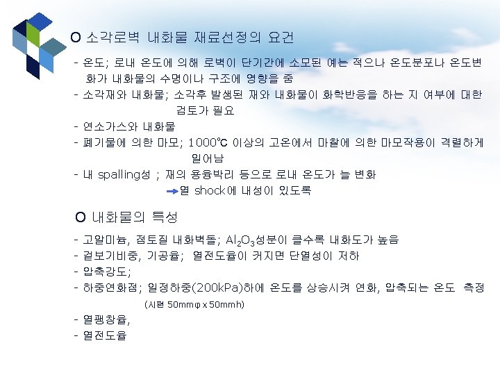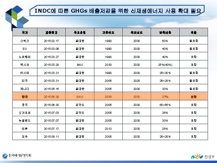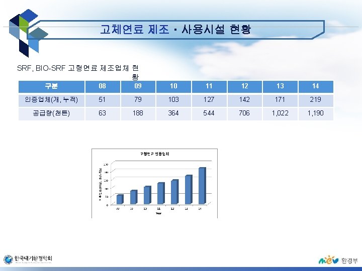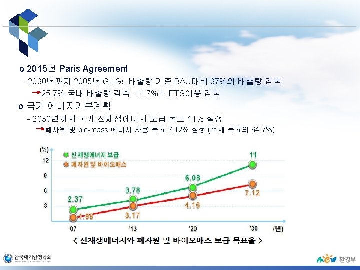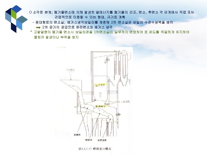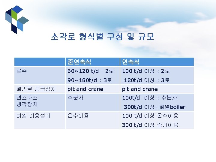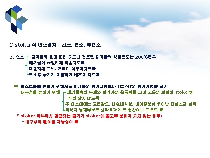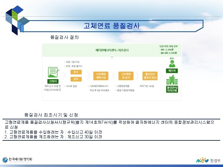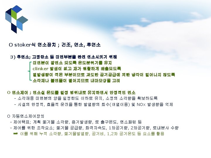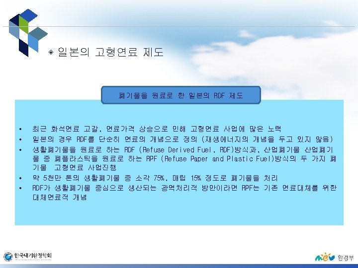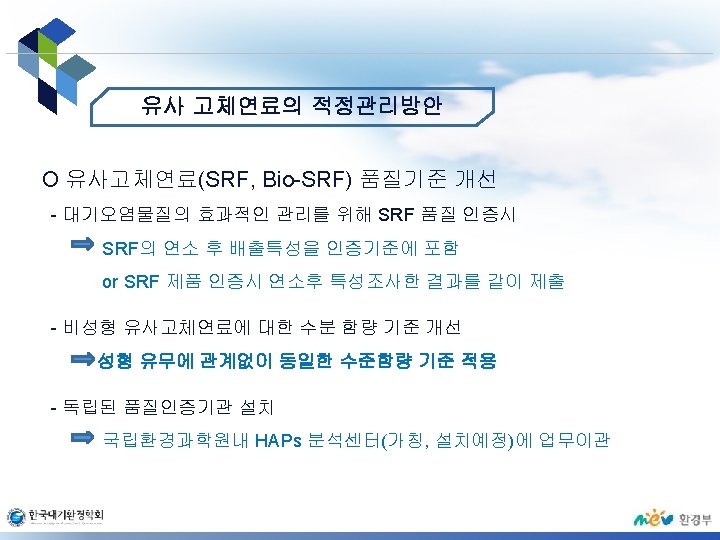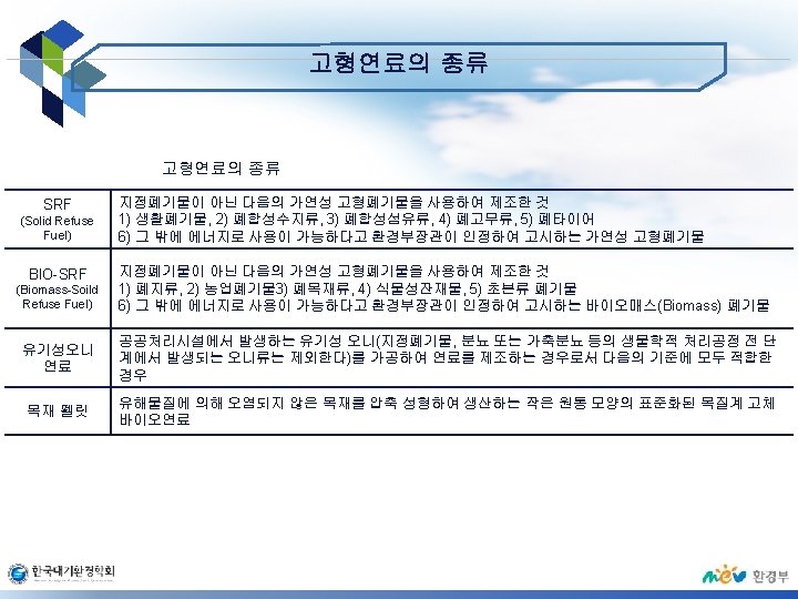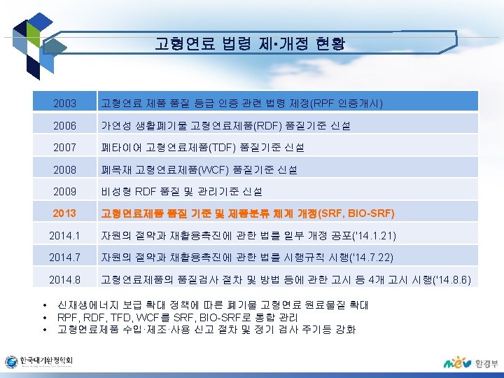 고형연료의 품질기준의 문제점 및 보완 고형연료 혼합시설에서의 대기배출허용 기준(WID ANNEX Ⅱ) solid fuels with excepiton of biomass(O 2 ontent 6%) biomass(O 2 content 6%) liquid fuels(O 2 content 3%) 구분 ∼ 50 MWTh 50∼ 100 MWTh 100∼ 300 MWTh 300∼MWTh Dust 50 50 30 30 SO 2 - 850 200 - 200 200 - 850 400∼ 200 a) 200 NOx - 400 200 - 350 300 200 - 450 200 • 혼소 비율과 관계없이 고형연료 사용시 배출허용기준 적용
