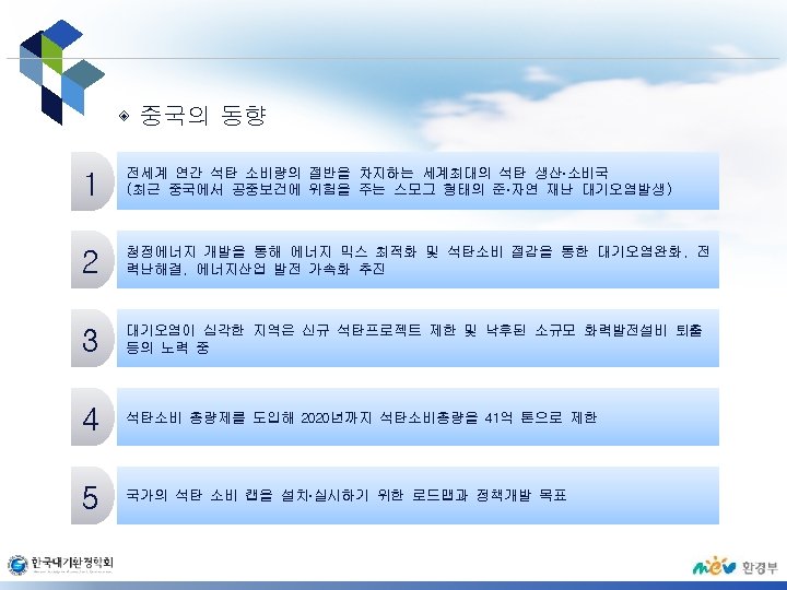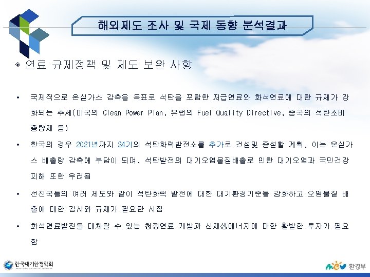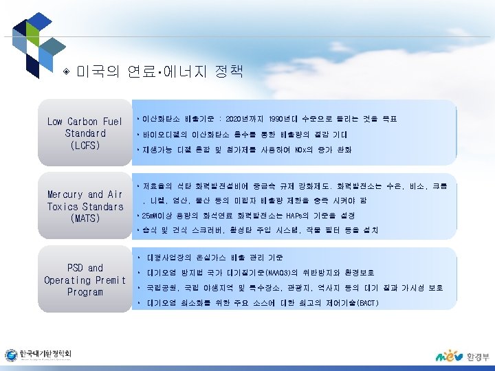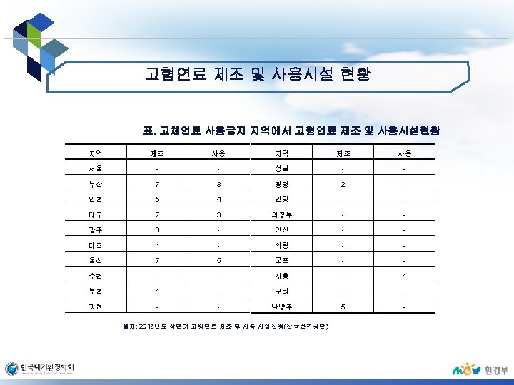 대기질 개선을 위한 연료 규제정책의 도입 및 경과 o Three regulation laws for fuel are as follow; 1. extend the use of low sulfur-containing fuel ; 1981년 - designate a city to have to use low-sulfur containing fuel - firstly Seoul ; designated as a city to use low-sulfur containing fuel (below 0. 4%) in 1981, - other 20 cities ; also designated such cities (below 0. 1%) in 1994 - progressively extended to 58 cities in 2015 2. designate a city to prohibit from using solid fuel ; 1985년 - 14 cities in 1985 designated prohibit from using solid fuel as heating fuel in the residence area - extended to 20 cities in 1999 3. designate a city only to use clean fuel ; 1988년 - only use clean energy (liquid and gas fuel) designated at Seoul in 1988 - extended to 38 cities in 2002