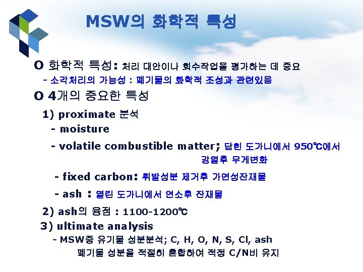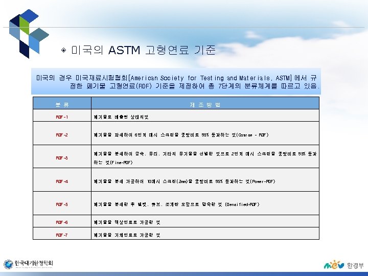 유럽의 고형연료 품질기준 분석방법 CEN/TC 343 Solid Recovered Fuels(ICS 75. 160. 10) 분류 WG 1 WG 2 WG 3 제목 전문 용어 및 품질보 증 연료 종류 및 등급 샘플링 및 샘플 정리 및 추가적 실험방법 항목 CEN/TS 15357: 2006 CEN/TS 15358: 2006 CEN/TS 15359: 2006 CEN/TR 15508: 2006 CEN/TS 15440: 2006 CEN/TR 14980: 2004 CEN/TS 15442: 2006 CEN/TS 15443: 2006 CEN/TR 15591: 2007 CEN/TS 15747: 2008 CEN/TS 15400: 2006 WG 4 물리적 및 기계적 실 험 화학적 실험 CEN/TS 15590: 2007 CEN/TS 15401: 2010 CEN/TS 15402: 2006 CEN/TS 15404: 2006 CEN/TS 15405: 2006 CEN/TS 15414 -1: 2010 CEN/TS 15414 -2: 2010 CEN/TS 15415: 2006 CEN/TR 15716: 2008 CEN/TS 15407: 2006 CEN/TS 15408: 2006 CEN/TS 15410: 2006 CEN/TS 15411: 2006 CEN/TS 15412: 2010 CEN/TS 15413: 2006 CEN/TS 15406: 2006 CEN/TS 15414 -3: 2010 CEN/TS 15639: 2007 WG 5 CEN/TR 15441: 2006