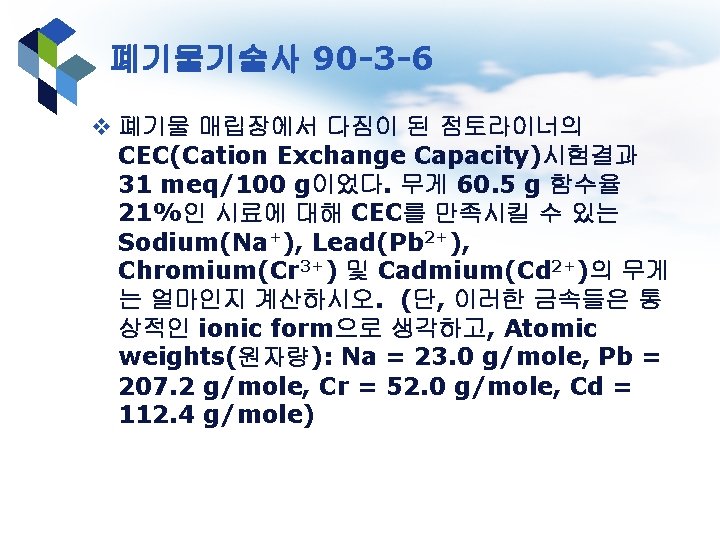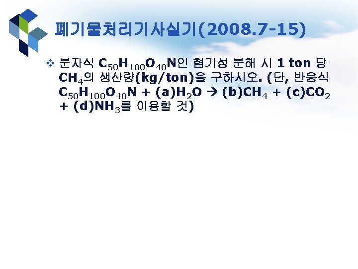 H 2 O중 1/8(H/O=2/16)은 H, 7/8은 O 총 waste 250, 000 lb* 0. 02875