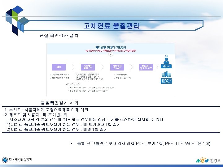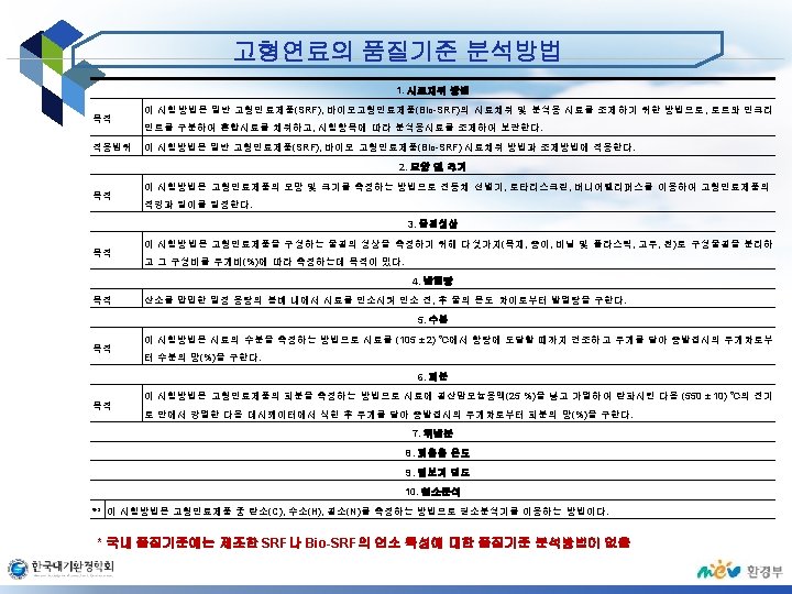 유럽의 고형연료 품질기준 분석방법 CEN/TS 343 WG 1 CEN/TS 15357: 2006 SRF- 전문용어 정의 및 설명 CEN/TS 15358: 2006 SRF-품질관리 시스템: SRF의 생산성에 적용하기 위한 특정 필수조건 CEN/TS 343 WG 2 CEN/TS 15359: 2006 SRF - 종류 및 등급 CEN/TR 15508: 2006 SRF - 분류 시스템을 입증하기 위해 사용된 SRF의 중요 특성 CEN/TS 343 WG 3 CEN/TS 15440: 2006 SRF - biomass 측정 방법 CEN/TR 15441: 2006 SRF - 직업과 관련된 건강적인 측면에서의 가이드라인 CEN/TS 343 WG 4 C EN/TS 15400: 2006 SRF - 발열량 측정방법 CEN/TS 15405: 2006 SRF - 펠렛과 연탄의 밀도 측정방법 CEN/TR 15716: 2008 SRF - 연소 거동 측정 CEN/TS 15639: 2007 SRF - 펠렛의 기계적 내구성 측정 방법 CEN/TS 343 WG 5 CEN/TS 15407: 2006 SRF - C, H, N 측정방법 CEN/TS 15408: 2006 SRF - S, Cl, F, Br 측정방법 CEN/TS 15410: 2006 SRF - 주요원소 측정 방법(Al, Ca, Fe, K, Mg, Na, P, Si, Ti) CEN/TS 15411: 2006 SRF - 미량원소 측정 방법 (As, Ba, Be, Cd, Co, Cr, Cu, Hg, Mo, Mn Ni, Pb, Se, Te, V, Zn) CEN/TS 15412: 2010 SRF - 금속 알루미늄 측정 방법 CEN/TS 15413: 2006 SRF - 실험용 시료에 의한 실험 샘플 전처리 방법