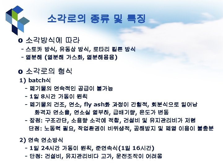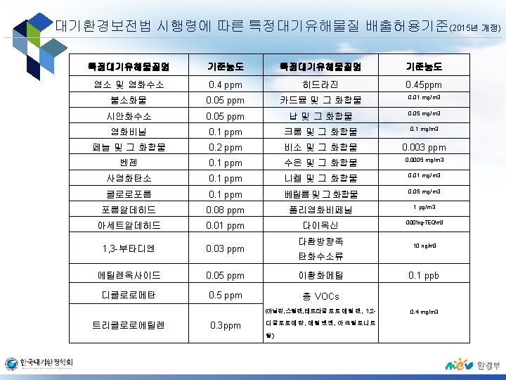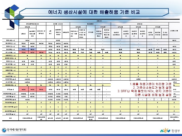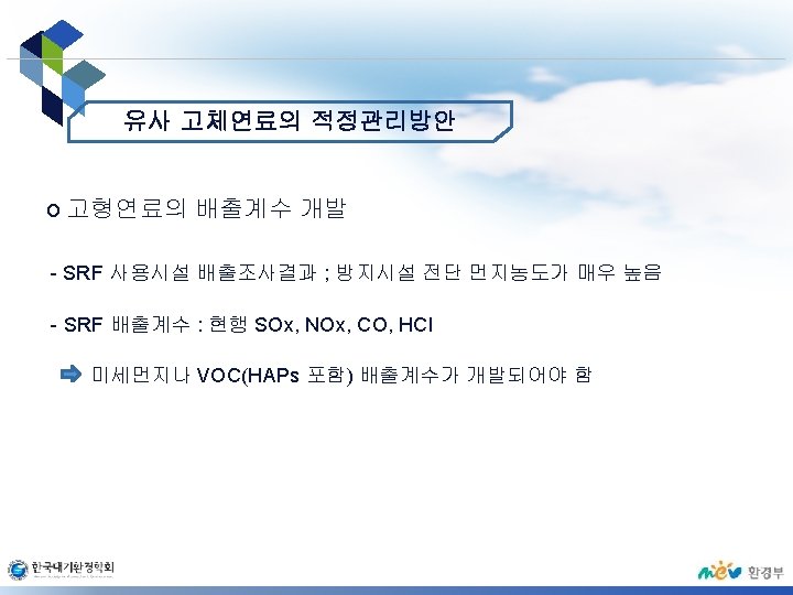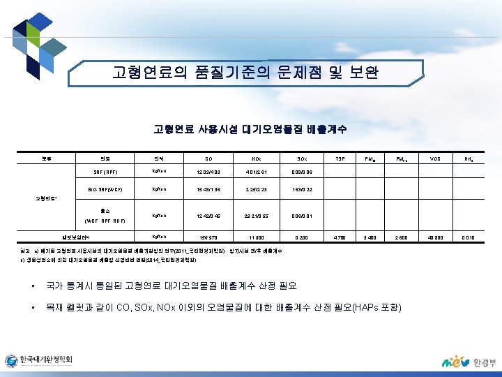 미국 고형연료의 배출계수 미국 고형연료 사용시설 배출계수(EPA-42) • • Pollutant Uncontrolled ESPc SD/ESPd SD/FFe PMf 34. 8 0. 517 4. 82× 10 -2 6. 64× 10 -2 Asg 2. 97× 10 -3 6. 70× 10 -5 5. 41× 10 -6 2. 59× 10 -6 h Cdg 4. 37× 10 -3 1. 10× 10 -4 4. 18× 10 -5 1. 66× 10 -5 h Crg 6. 99× 10 -3 2. 34× 10 -4 5. 44× 10 -5 2. 04× 10 -5 Hgg 2. 8× 10 -3 2. 10× 10 -4 1. 46× 10 -4 Nig 2. 18× 10 -3 9. 05× 10 -3 9. 64× 10 -5 3. 14× 10 -5 j Pbg 0. 1 1. 84× 10 -3 h 5. 77× 10 -4 5. 19× 10 -4 SO 2 1. 95 ND 0. 799 2. 21× 10 -1 HClg 3. 49 ND ND 2. 64× 10 -2 NOxk 2. 51 ND ND 2. 64× 10 -2 COk 0. 96 ND ND 2. 64× 10 -2 CO 2 m 1. 34× 103 ND ND 2. 64× 10 -2 CDD/CDFn 4. 73× 10 -6 8. 46× 10 -6 5. 31× 10 -8 1. 22× 10 -8 국가 통계시 통일된 고형연료 대기오염물질 배출계수 산정 필요 방지시설 유형별 배출계수 적용 대기오염물질 배출물질 파악 및 관리 가능