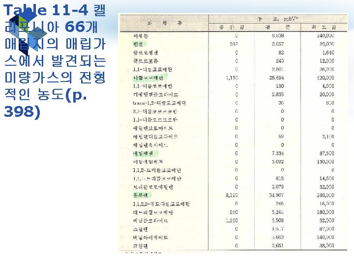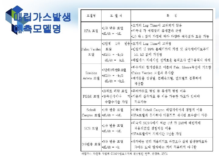 Figure 11 -12 Graphical representation of gas production over a five-year period from the rapidly and slowly decomposable organic materials placed in a landfill (p. 406) v 가스 발생에 의해 측정된 분해속도는 초기 2년내 에 최고에 달하고 25년 까지 게속되면서 천천히 줄어듬 v Triangular gas production model v (89 -3 -6) 매립가스 발 생량 예측 시 사용되는 Kinetic Model 3가지 와 그 특징을 설명하시오. v (83 -2 -1) 매립가스발생 량을 추정하는 방법에 대