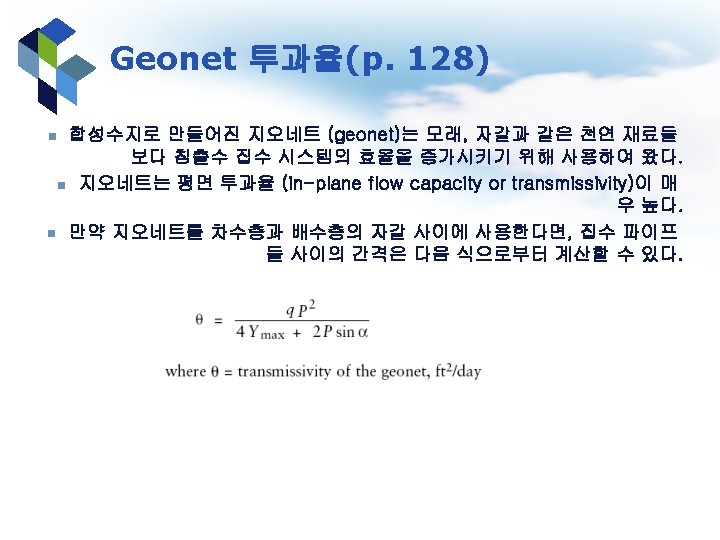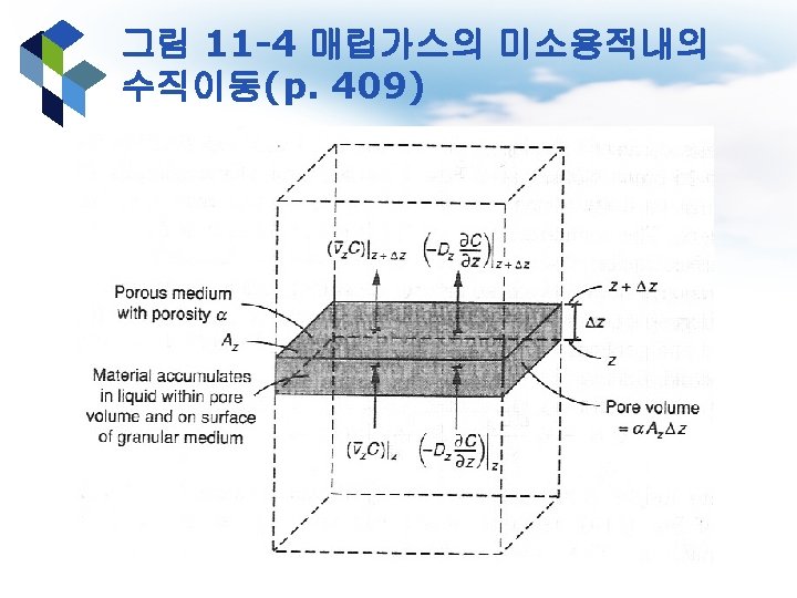 Vadose zone v Movement of water within the vadose zone is studied within soil physics and hydrology, particularly hydrogeology, and is of importance to agriculture, contaminant transport, and flood control. v The Richards equation is often used to mathematically describe the flow of water, which is based partially on Darcy's law. v Recharge, which is an important process that refills aquifers (대수층(帶水層)(지하수 를 품은 다공질(多孔質)의 지층)), generally occurs through the vadose zone from precipitation.