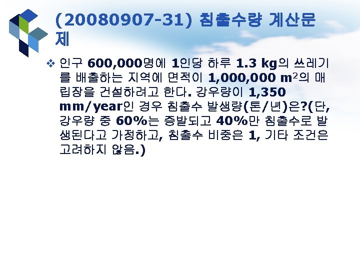 Figure 11 -13 Effect of reduced moisture content on the production of landfill gas (p. 407) v 매립지 수분이 제한될 때 가스발생곡선이 더 완만해 지고 가스발생이 오래 지속됨 v Bioreactor landfill과 연관지어 설명
