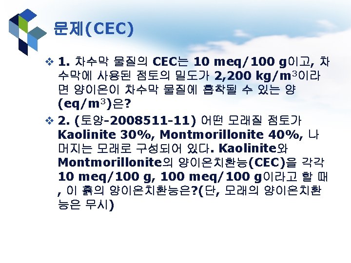 Cation-exchange capacity v In soil science, cation-exchange capacity (CEC) is the maximum quantity of total cations, of any class, that a soil is capable of holding, at a given p. H value, for exchanging with the soil solution. v CEC is used as a measure of fertility, nutrient retention capacity, and the capacity to protect groundwater from cation contamination. v It is expressed as milliequivalent of hydrogen per 100 g (meq+/100 g), or the SI unit centi-mol per kg (cmol+/kg). v Clay and humus have electrostatic surface charges that attract the solution