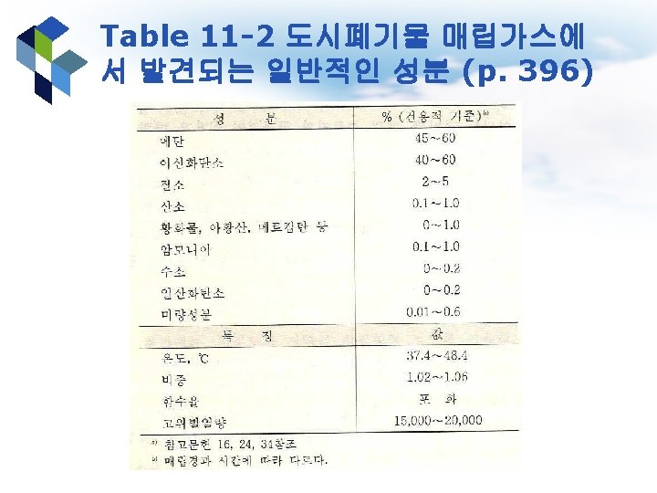 Table 11 -27 Important factors that must be considered in the operation of landfills (p. 498)