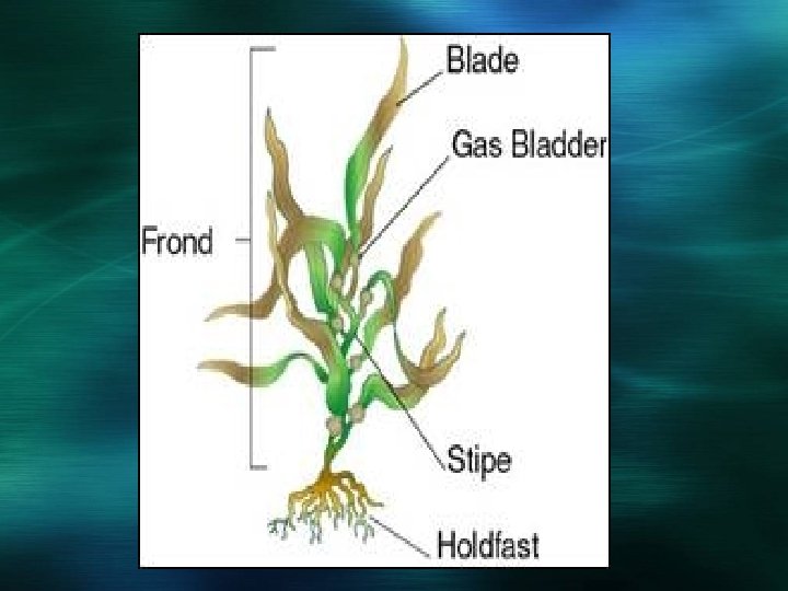 Multicellular Algae: The Seaweeds The most familiar types of marine algae are seaweeds. Seaweeds share a general structure, although they show a wide range of growth forms and complexity of structures: Thallus ~ complete body Blades ~ leaf-like, flattened portions of the thallus Pneumatocysts ~ gas-filled bladders that keep blades close to the surface Stipe ~ stem-like structure that provides support Holdfast ~ structure that resembles roots, attaching the thallus to the bottom