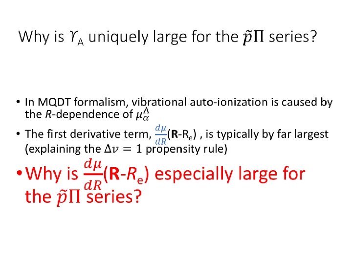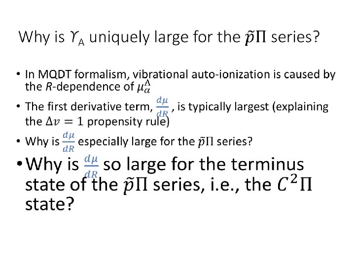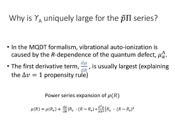 Overview Mulliken’s Rule Along each Rydberg series, the shape of the innermost lobe of the Rydberg orbital wavefunction is invariant. Its amplitude scales as n*-3/2. Almost all dynamics in Rydberg-land is determined by the shape and amplitude of this innermost lobe. Simple model: ligand-field theory for ”series terminus” states MQDT calculation of vibrational auto-ionization lifetime Provides both insights and accurate predictions