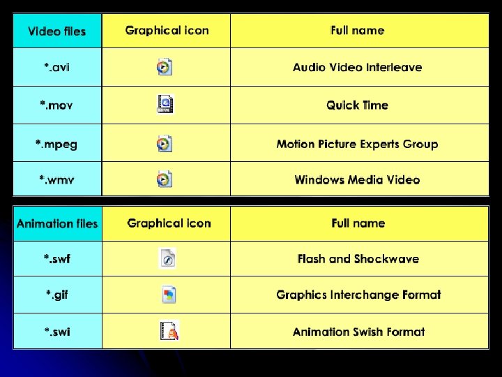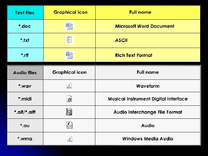 FORMATOS DE ARCHIVOS ESTANDARD Cada uno de los cinco elementos mencionados tiene varios formatos de archivos estándares. el formato del archivo es una manera particular de almacenar la información en una computadora. Los formatos permitirán que usted tome las decisiones del tipo de texto, del gráfico, del audio, del vídeo y de la animación para utilizar al desarrollar su propio programa de multimedia.
