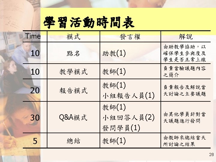 教學環境 定時不定點之學習活動 n 使用 具 n Around NT$ 400, 000 同步式教學系統,如Home. Meeting Join. Net Around n Web Cam NT$ n 麥克風 3, 600 n Around NT$ 3, 200 26