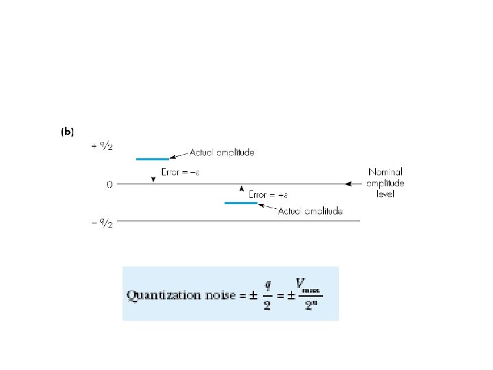Kvantiseringsdistorsion (kvantiseringsbrus) q Avrundningsfelet låter ofta som ett brus. q Svaga ljud avrundas bort, eller dränks i kvantiseringsbruset. q Varje extra bit upplösning ger dubbelt så många spänningsnivåer, vilket ger en halvering av kvantiseringsdistorsionens spänningsnivå, dvs en fjärdedels effekt, dvs en minskning med 6 d. B. q N bit upplösning ger ett signal-till-kvantiseringsbrusförhållande (SQR=Signal to quantization noise ratio) på i storleksordning N*6 d. B (det kan skilja några d. B beroende på hur man definierar max signalnivå. )