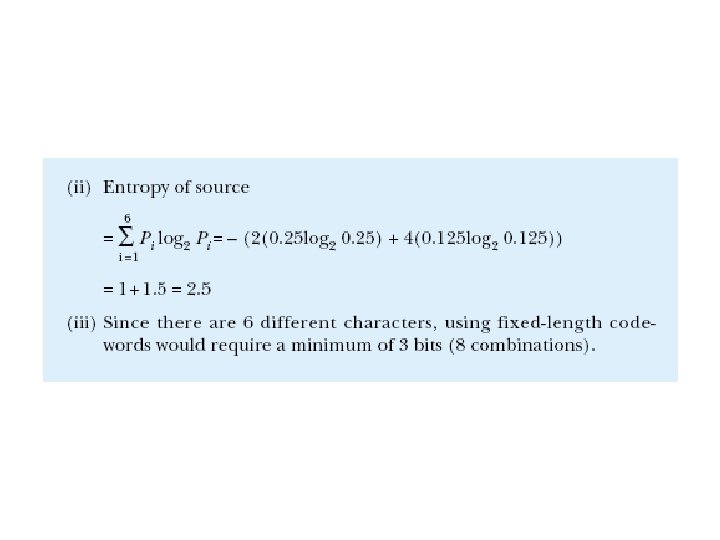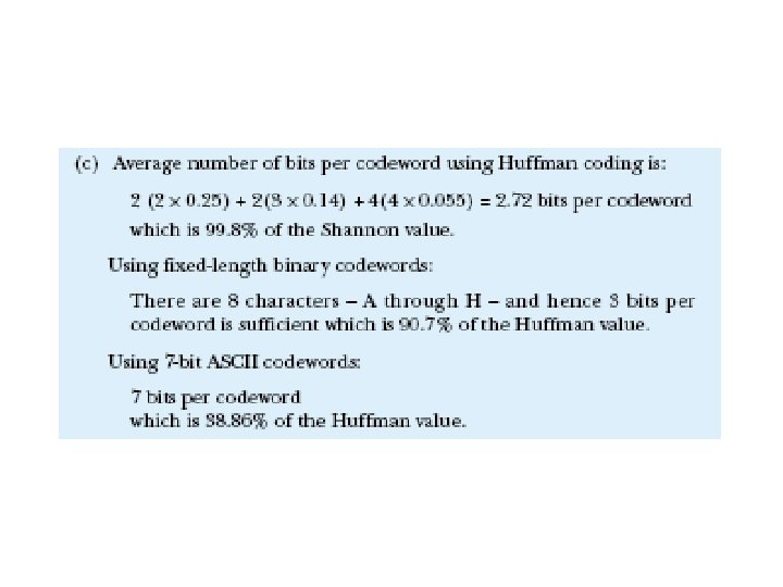 Språkets entropi. Exempel: Om det engelska alfabetets 26 bokstäver vore lika vanliga blir entropin per bokstav: Men, den verkliga entropin i det engelska språket är 2. 62 bit/bokstav. Det går alltså att komprimera till den nivån, med hjälp av en variabellängd-kod, dvs en kod som har olika antal bit för olika tecken, t. ex. s. k. Huffmankodning.