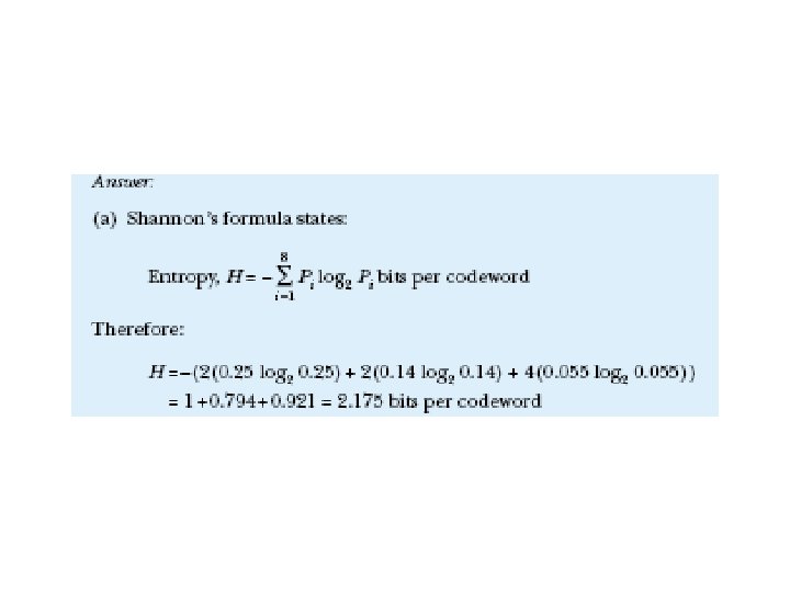 Shannons entropi-formel Entropi = informationsmängd per kodord, dvs minsta möjliga antal bit per kodord efter datakompression.