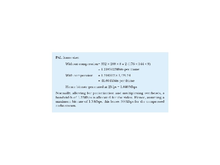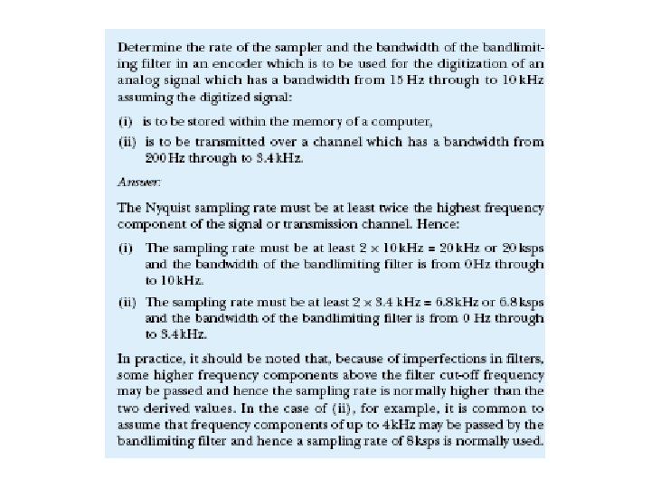 Example What sampling rate is needed for a signal with a bandwidth of 10, 000 Hz (1000 to 11, 000 Hz)? Solution The sampling rate must be twice the highest frequency in the signal: Sampling rate = 2 x (11, 000) = 22, 000 samples/s