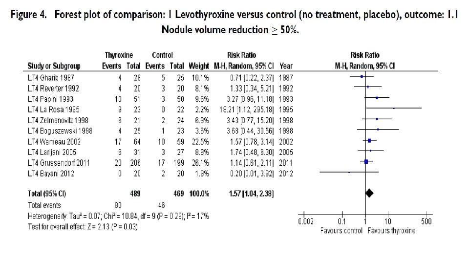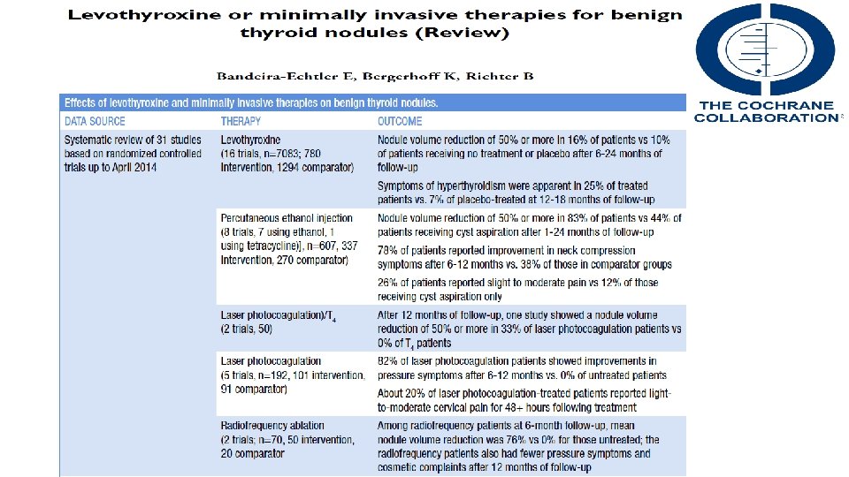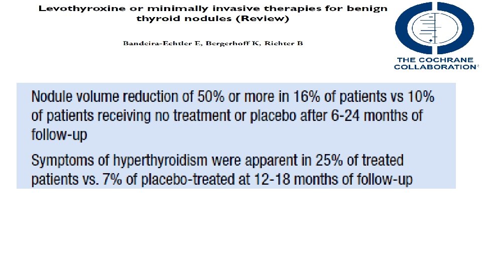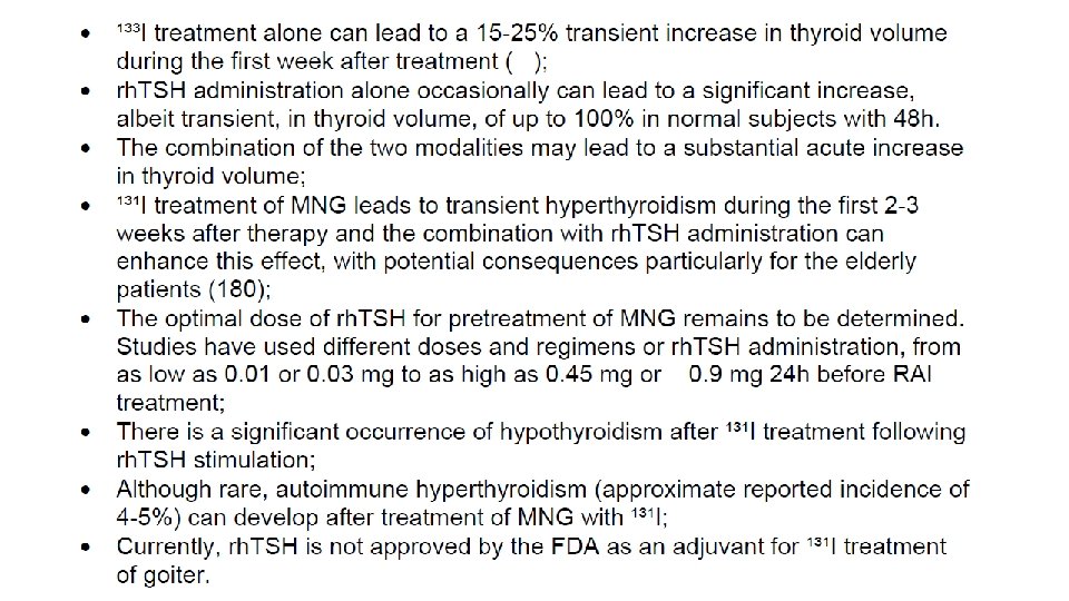 rh. TSH increases the thyroid 24 -h RAIU by 100% or even more Without compromising the 131 I half-life to any greater extent Causes more homogeneous distribution of 131 I within the goiter Increase in the thyroid RAIU inversely correlated to the initial RAIU Most beneficial in patients with MNG with low thyroid RAIU Use of rh. TSH is restricted to thyroid cancer patients Off-label drug for patients with benign thyroid diseases Unknown long-term effect of rh. TSH stimulated 131 I therapy With a ‘superiority strategy’ the goiter reduction is on Average enhanced by 35– 56% 1 year after 131 I-therapy The gain is most pronounced in large goiters Randomized trials have failed to demonstrate a positive impact on Patient satisfaction and quality of life