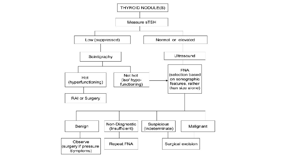 Serum TSH Patients with nodular goiter should have a complete history and Physical exam, and serum TSH levels should be measured (Rec. 1 -A) If low, a thyroid scintigraphy (using either technetium 99 m. Tc Pertechnetate or 123 I) should be performed Low serum levels of TSH suggest overt or subclinical hyperthyroidism And presence of hyperfunctioning (“hot”) nodules(Rec. 1 -A) “Hot” nodules need not FNA Serum TSH levels are an independent predictor of malignancy Associated with a more advanced stage of the disease