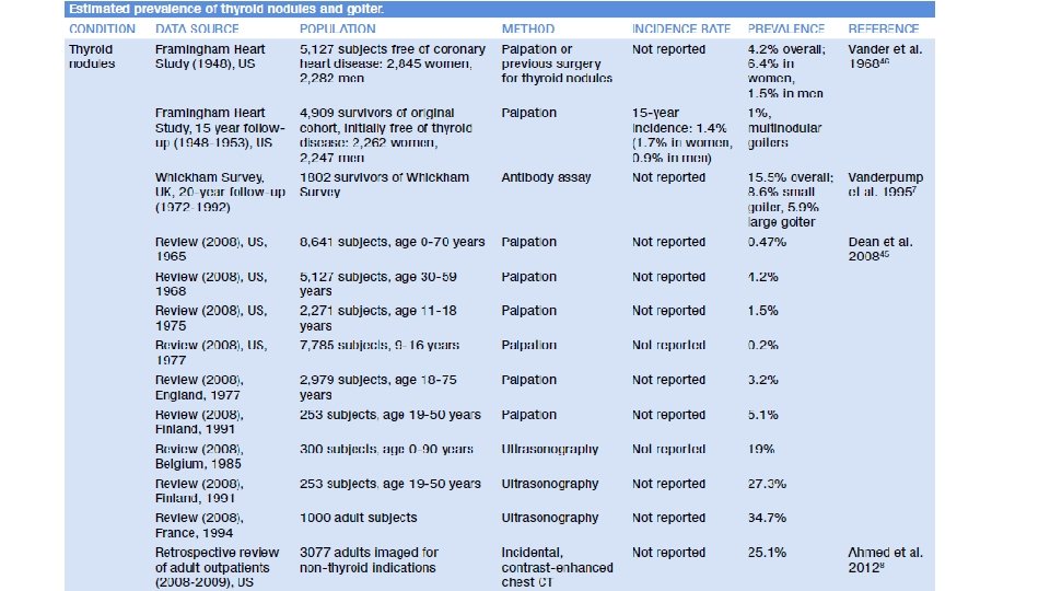 Epidemiology • Prevalence is 5% by palpation • Prevalence is 50% by US • Annual incidence is 0. 1% which means 350, 000 new nodules in U. S. in 2014 • >600, 000 FNAs per yr • More common in women, in elderly, with I-deficiency and after radiation • 95% are benign
