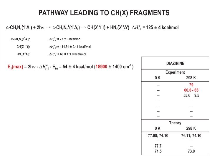 Calculated Equilibrium Structure CCSD(T)/cc-p. VTZ B 3 LYP/6 -311 G(2 df, p) 49. 2 48. 5 1. 075 1. 081 119. 6 119. 5 Structural Isomer Relative Energy (kcal/mol) isodiazirine 22. 2 65. 4 65. 7 1. 229 1. 216 diazirine ΔHf 0 = 77 ± 3 0 1. 477 1. 479 diazomethane HOMO (n): -9. 3 Isoelectronic with ketene H Bonding along CN. H C C O