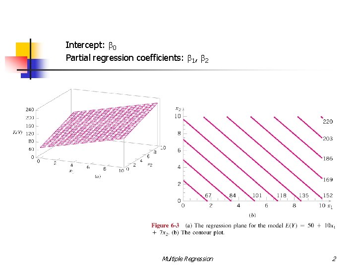 Multiple Linear Regression n Multiple Regression Model n n A regression model that contains more than one regressor variable. Multiple Linear Regression Model n A multiple regression model that is a linear function of the unknown parameters b 0, b 1, b 2, and so on. Examples: n Nonlinear: n Multiple Regression 1