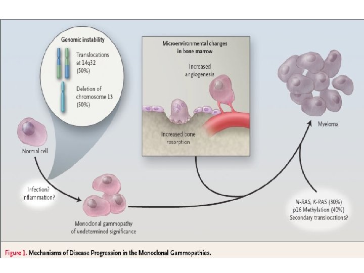 MM: Prognostic Factors Cytogenetics: • Cytogenetics abnormalities occur in 80 -90% of patients. • FISH is the best technique to discover them. • Del 13 (partial or complete) & t involving 11 q are associated with poor prognosis in ABMT patients only. • Hypodiploidy is associated with drug resistance. • Any abnormal karyotype leads to inferior outcome with standard therapy.