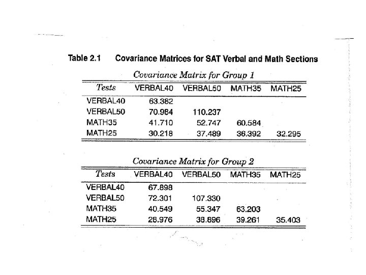 Confirmatory Factor Analysis: Data • Covariance matrices are for two samples (n 1=865 and n 2=900) of candidates who took the SAT in January 1971. • Total observations: n=1765 • Degrees of Freedom: 2 * 4(5) = 20 2
