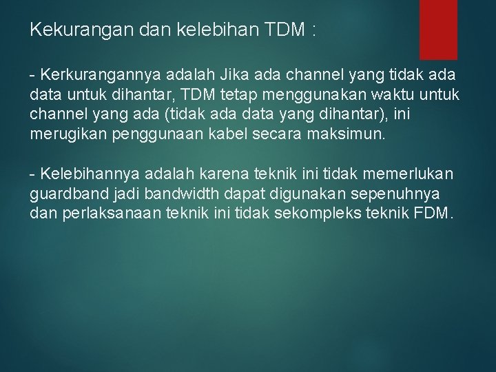 Kekurangan dan kelebihan TDM : - Kerkurangannya adalah Jika ada channel yang tidak ada data untuk dihantar, TDM tetap menggunakan waktu untuk channel yang ada (tidak ada data yang dihantar), ini merugikan penggunaan kabel secara maksimun. - Kelebihannya adalah karena teknik ini tidak memerlukan guardband jadi bandwidth dapat digunakan sepenuhnya dan perlaksanaan teknik ini tidak sekompleks teknik FDM.