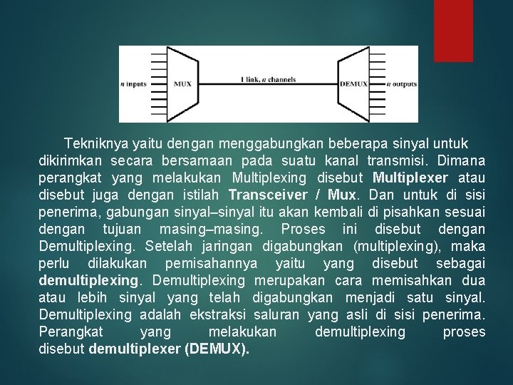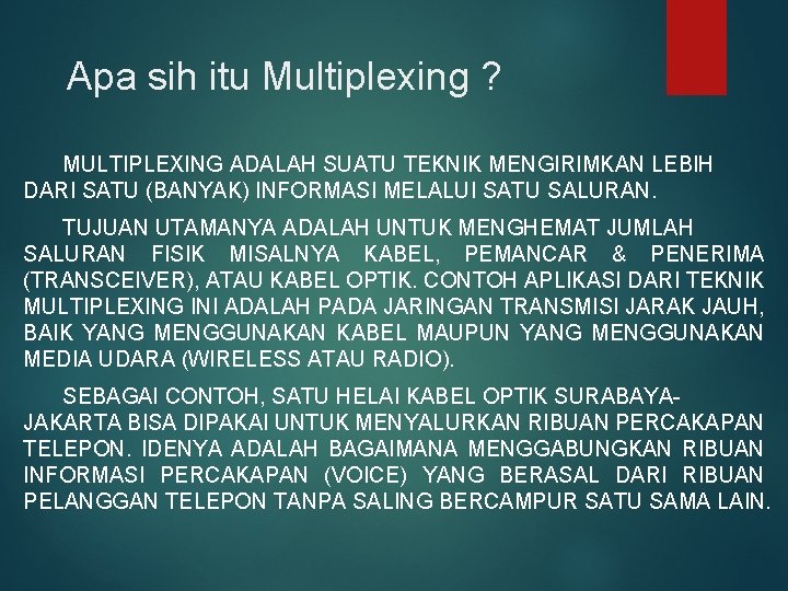 Apa sih itu Multiplexing ? MULTIPLEXING ADALAH SUATU TEKNIK MENGIRIMKAN LEBIH DARI SATU (BANYAK) INFORMASI MELALUI SATU SALURAN. TUJUAN UTAMANYA ADALAH UNTUK MENGHEMAT JUMLAH SALURAN FISIK MISALNYA KABEL, PEMANCAR & PENERIMA (TRANSCEIVER), ATAU KABEL OPTIK. CONTOH APLIKASI DARI TEKNIK MULTIPLEXING INI ADALAH PADA JARINGAN TRANSMISI JARAK JAUH, BAIK YANG MENGGUNAKAN KABEL MAUPUN YANG MENGGUNAKAN MEDIA UDARA (WIRELESS ATAU RADIO). SEBAGAI CONTOH, SATU HELAI KABEL OPTIK SURABAYAJAKARTA BISA DIPAKAI UNTUK MENYALURKAN RIBUAN PERCAKAPAN TELEPON. IDENYA ADALAH BAGAIMANA MENGGABUNGKAN RIBUAN INFORMASI PERCAKAPAN (VOICE) YANG BERASAL DARI RIBUAN PELANGGAN TELEPON TANPA SALING BERCAMPUR SATU SAMA LAIN.