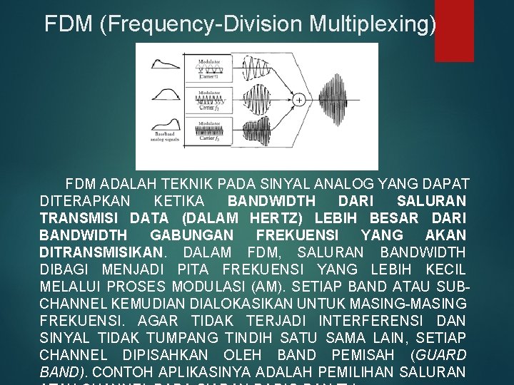 FDM (Frequency-Division Multiplexing) FDM ADALAH TEKNIK PADA SINYAL ANALOG YANG DAPAT DITERAPKAN KETIKA BANDWIDTH DARI SALURAN TRANSMISI DATA (DALAM HERTZ) LEBIH BESAR DARI BANDWIDTH GABUNGAN FREKUENSI YANG AKAN DITRANSMISIKAN. DALAM FDM, SALURAN BANDWIDTH DIBAGI MENJADI PITA FREKUENSI YANG LEBIH KECIL MELALUI PROSES MODULASI (AM). SETIAP BAND ATAU SUBCHANNEL KEMUDIAN DIALOKASIKAN UNTUK MASING-MASING FREKUENSI. AGAR TIDAK TERJADI INTERFERENSI DAN SINYAL TIDAK TUMPANG TINDIH SATU SAMA LAIN, SETIAP CHANNEL DIPISAHKAN OLEH BAND PEMISAH (GUARD BAND). CONTOH APLIKASINYA ADALAH PEMILIHAN SALURAN