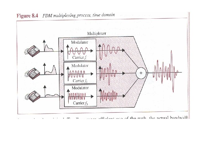 Frequency-division Multiplexing (FDM) • In FDM, signals are modulated onto separate carrier frequencies using either AM or FM modulation.