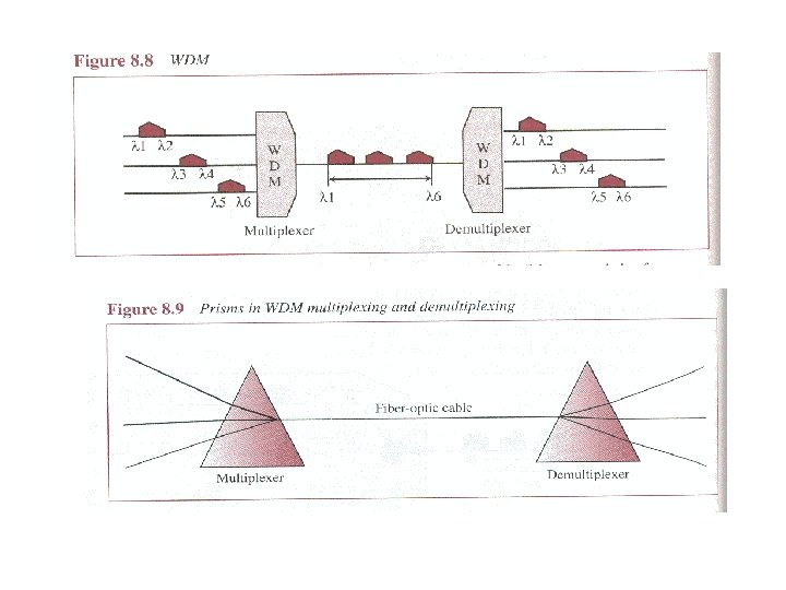 Wave-division Multiplexing (WDM) • Wave-division multiplexing is conceptually the same as FDM, except that multiplexing and demultiplexing involve light signals transmitted through fiber-optic channels. • The purpose is to combine multiple light sources into one single light at the multiplexer and do the reverse at the demultiplexer. • Combining and splitting of light sources are easily handled by a prism.