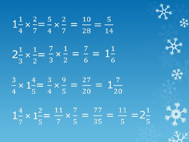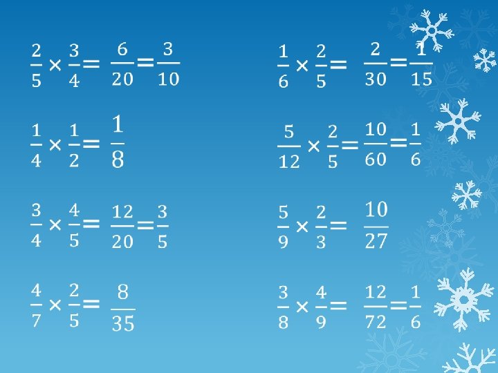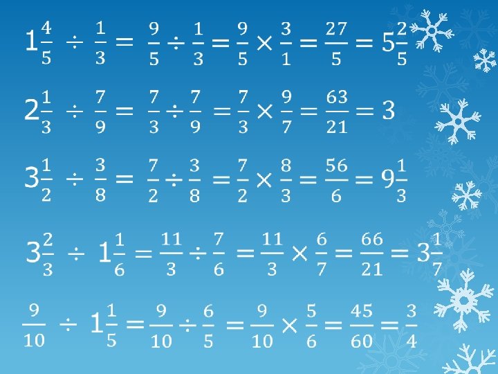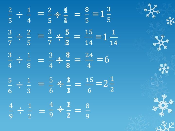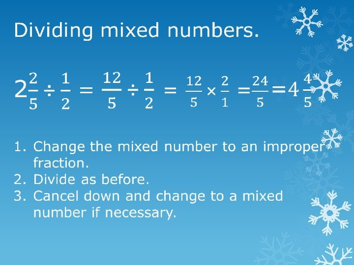 = × ÷ 1. Turn the dividing fraction upside down and change ÷ to ×. 2. Multiply numerators and denominators. 3. If necessary cancel down and change to a mixed number.