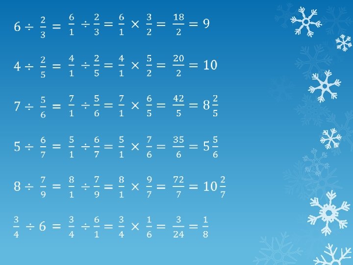 ÷ × 1. Whole numbers have a denominator of 1. 2. Turn dividing fraction upside down and multiply numerators and denominators. 3. Cancel down and change to a mixed number if necessary.