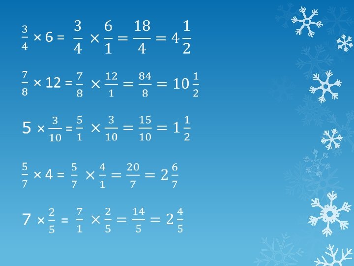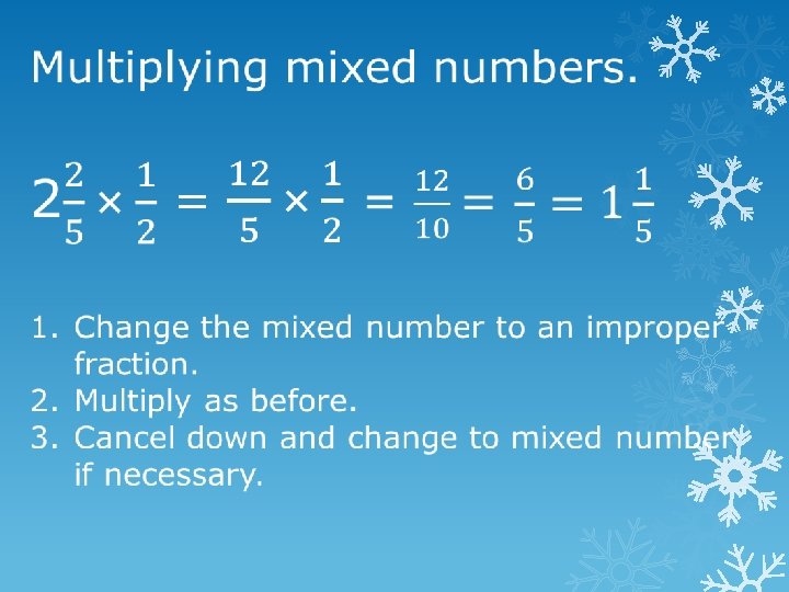 1. Whole numbers have a denominator of 1. 2. Multiply numerators and denominators. 3. Cancel down and change to a mixed number if necessary.