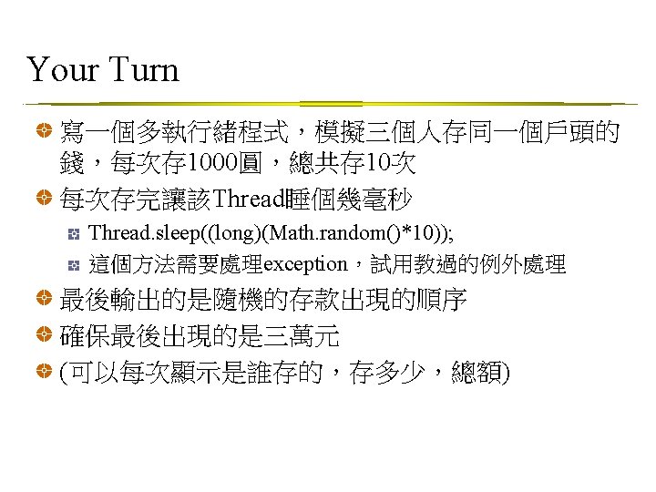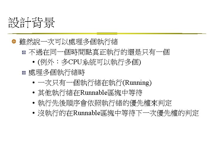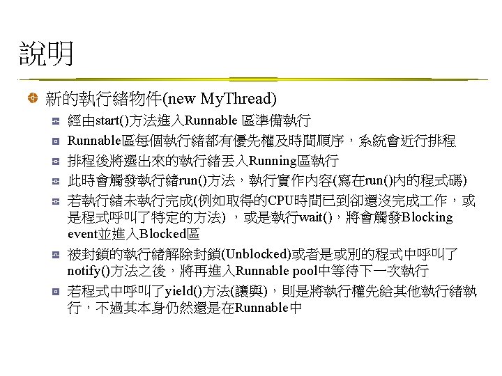 Thread類別 java. lang. Thread public class Thread extends Object implements Runnable 提供的基本方法 static yield() 讓目前running的暫停, 讓runnable的擇一跑 static sleep() 讓目前running的睡一個設定的時間 start() 啟動, 之後JVM可啟動該thread的run() set. Priority() • set. Priority(MAX_PRIORITY):給最大優先權 • set. Priority(MIN_PRIORITY):給最小優先權 • set. Priority(NORM_PRIORITY):預設的優先權