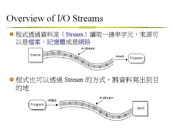 Overview of I/O Streams Byte Streams 用來處理 8 位元資料,如:執行檔、圖檔和聲音檔 Input. Stream 和 Output. Stream 是所有 byte streams 的 abstract superclasses