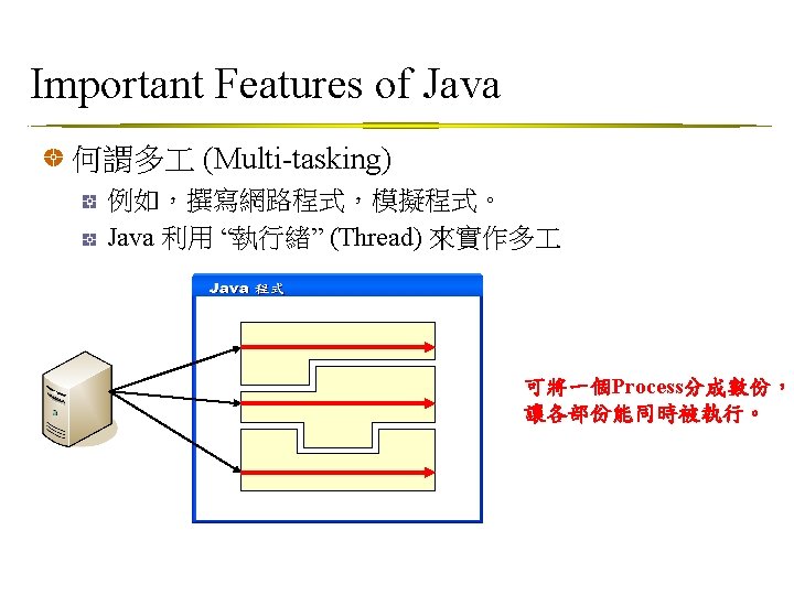 不能多重繼承時 (My. Thread 2. java) public class My. Thread 2 implements Runnable { int i; public void run() { i = 0; while (true) { System. out. println(Thread. current. Thread(). get. Name() + " " + (++i) + " " +Math. random()); class Test. Thread 2 if ( i == 5000 ) break; { } public static void main(String args[]) } { } My. Thread 2 r = new My. Thread 2(); Thread t 1 = new Thread(r); 先宣告一個空的 Thread t 2 = new Thread(r); t 1. set. Name(“t 1"); My. Thread 2類別物件r t 2. set. Name(“t 2"); 建立t 1, t 2 執行緒物件實 t 1. start(); t 2. start(); 體,其對象為 My. Thread 2中的run()方法 } }
