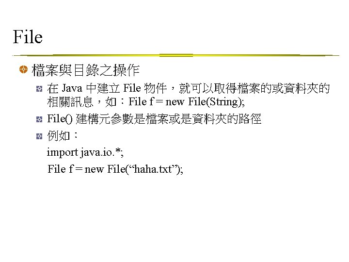 顯示檔案資訊範例 Exmaple: File. Info. java File f = new File(args[0]); if ( f. exists() ) { if ( f. is. File() ) System. out. print("File: "); else if(f. is. Directory()) System. out. print("Directory: "); System. out. println(f. get. Absolute. File()); System. out. println("Length: " + f. length()); System. out. println("Readable: " + f. can. Read()); System. out. println("Writable: " + f. can. Write()); } else System. out. println(f + " does not exist!");