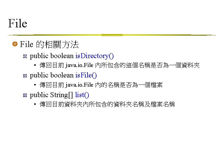顯示檔案資訊 相關方法 public boolean exists(): 檢查檔案是否存在 public boolean can. Read(): 是否可讀 public boolean can. Write(): 是否可寫 public get. Name(): 傳回該檔案的名稱 public long length(): 傳回檔案大小 public long last. Modified(): 傳回檔案修改時間 public get. Path(): 取得該檔案所屬的資料夾名稱 public get. Parent(): 取得該檔案所屬的父資料夾名稱 public get. Absolute. File(): 傳回該檔案的絕對路徑